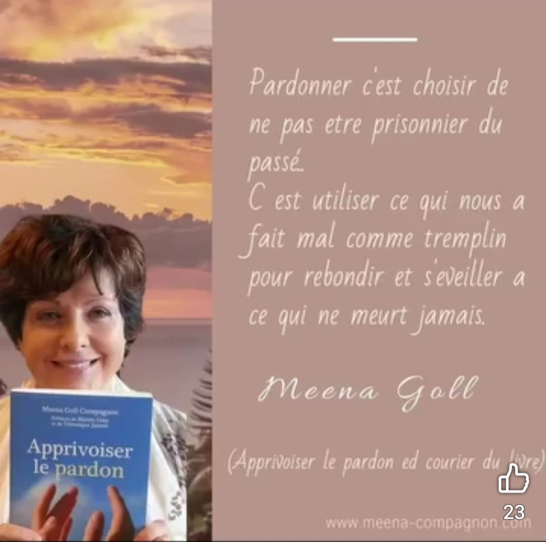 Le pardon vécu dans mon livre, “Apprivoiser le Pardon”, s’est manifesté quand j’ai pu recevoir le Don de mes épreuves, laisser ouvrir mon cœur à la Gratitude et réaliser qu’il n’y avait rien ni personne à pardonner.